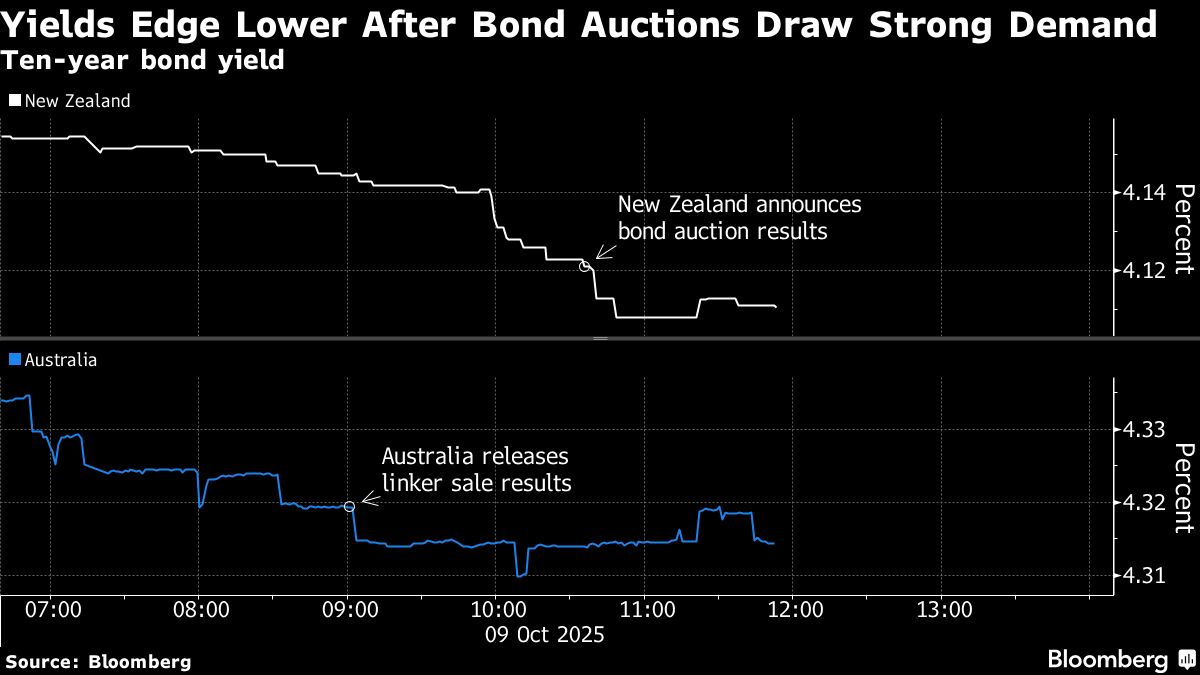 New Zealand’s 10-year yield fell seven basis points to 4.11% after the sale of May 2034 debt drew bids for 6.23 times the amount of offer, the most since this tenor was first auctioned in February 2023. The yield on similar-maturity Australian bonds dropped four basis points to 4.32% after the country sold two inflation-indexed securities.