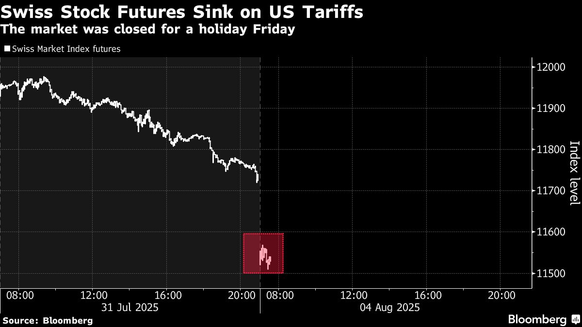 Swiss stock-index futures dropped Monday as the stock exchange prepared to reopen after a holiday, pricing in the impact of US President Donald Trump’s punitive 39% export tariff on the country.